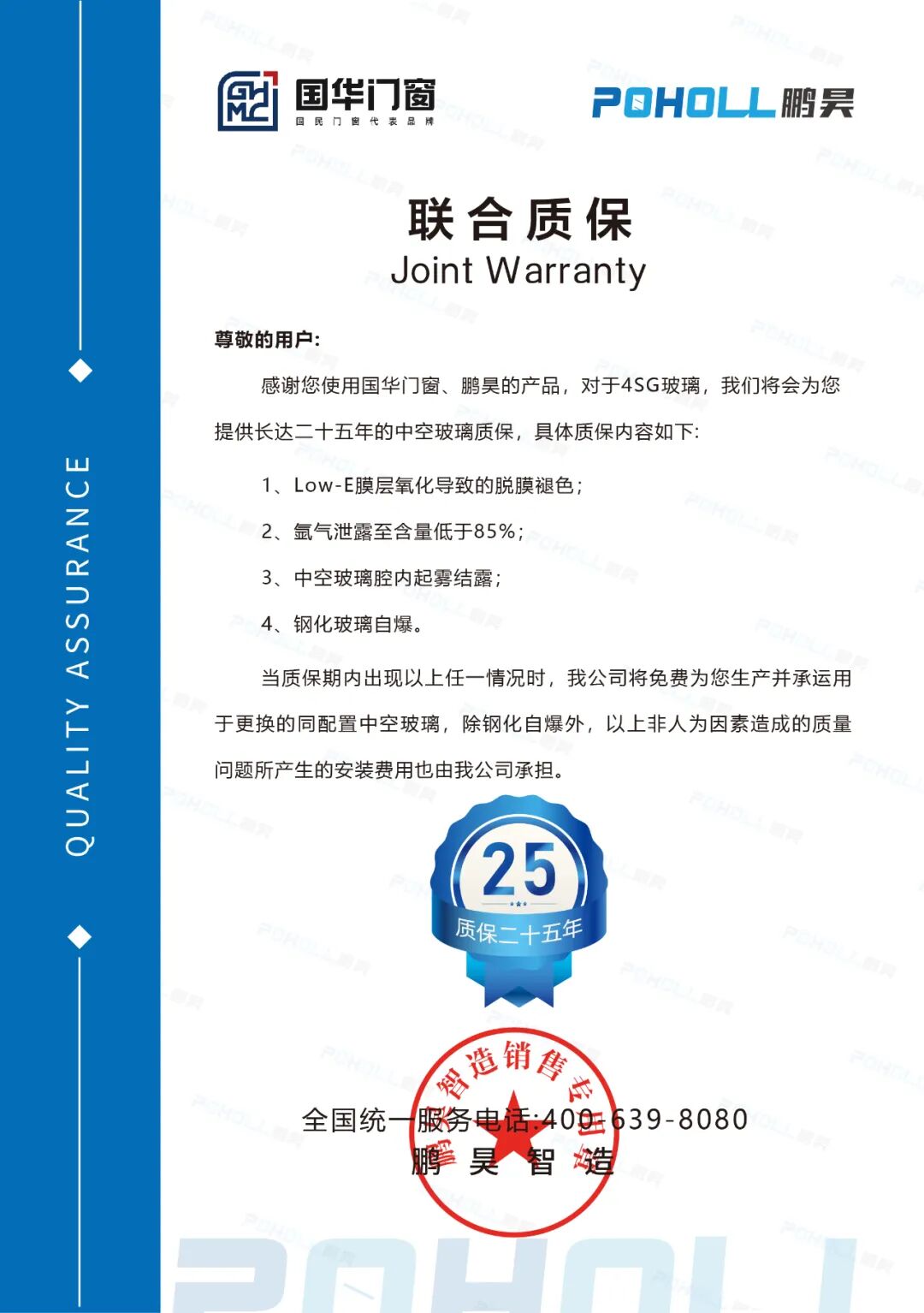 Ještě pozoruhodnější je, že Guohua Doors & Windows a Penghao společně spustily rozšířenou záruku, která poskytuje 4SG sklu s 25letou zárukou na izolační sklo. Tento závazek pokrývá několik klíčových problémů, včetně delaminace a změny barvy způsobené oxidací filmu Low-E, únik argonového plynu pod 85 %, zamlžování a kondenzace v dutině izolačního skla a spontánní výbuch tvrzeného skla. Taková komplexní a dlouhodobá záruka je v oboru vzácná a plně demonstruje důvěru obou stran v kvalitu produktů a jejich hluboký závazek vůči zákazníkům.